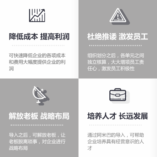拥有国内完善和实战的阿米巴经营落地体系,汇聚国内外55位阿米巴经营专家顾问,为企业导入落地阿米巴经营提供保障,不仅能够迅速提升企业短期利益,更加注重对企业经营人才培养和长期效益的保持。迄今为止,已累计帮助国内外上千家企业成功导入阿米巴经营。